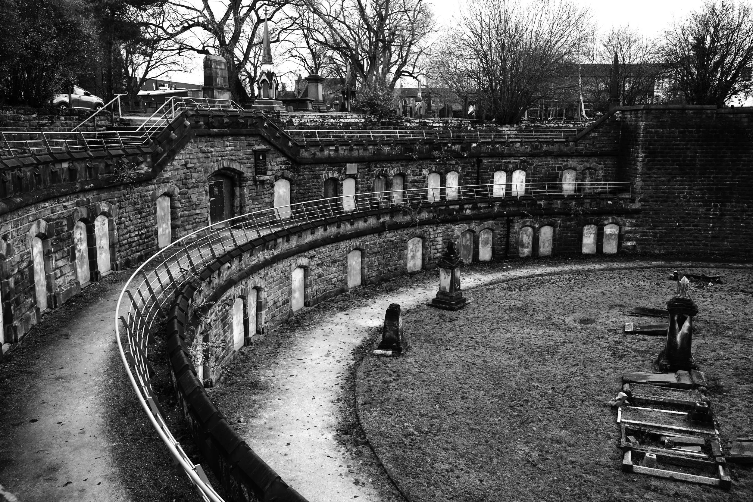 The Nonconformist Chapel at Coventry's London Road Cemetery is a Grade II* listed building designed in a classical Greek temple style, notable for its distinctive portico and flanking pavilions. Despite being a historically significant and Grade II* listed structure, it was in a poor state due to damage from World War II bombing, a fire in 1884, and a 2006 arson attack. Work has now been done to the exterior as you see in the picture.